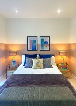 From a blank canvas to a playful, inspiring & colourful space for our client to call home. We used blocks of colour to section off the space, and to cut the bare white walls with interesting features.