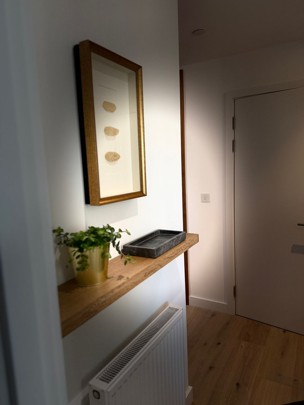 A compilation of minimalist interior designs featuring elegant shelves, plants, and framed artwork, creating a clean and sophisticated aesthetic.